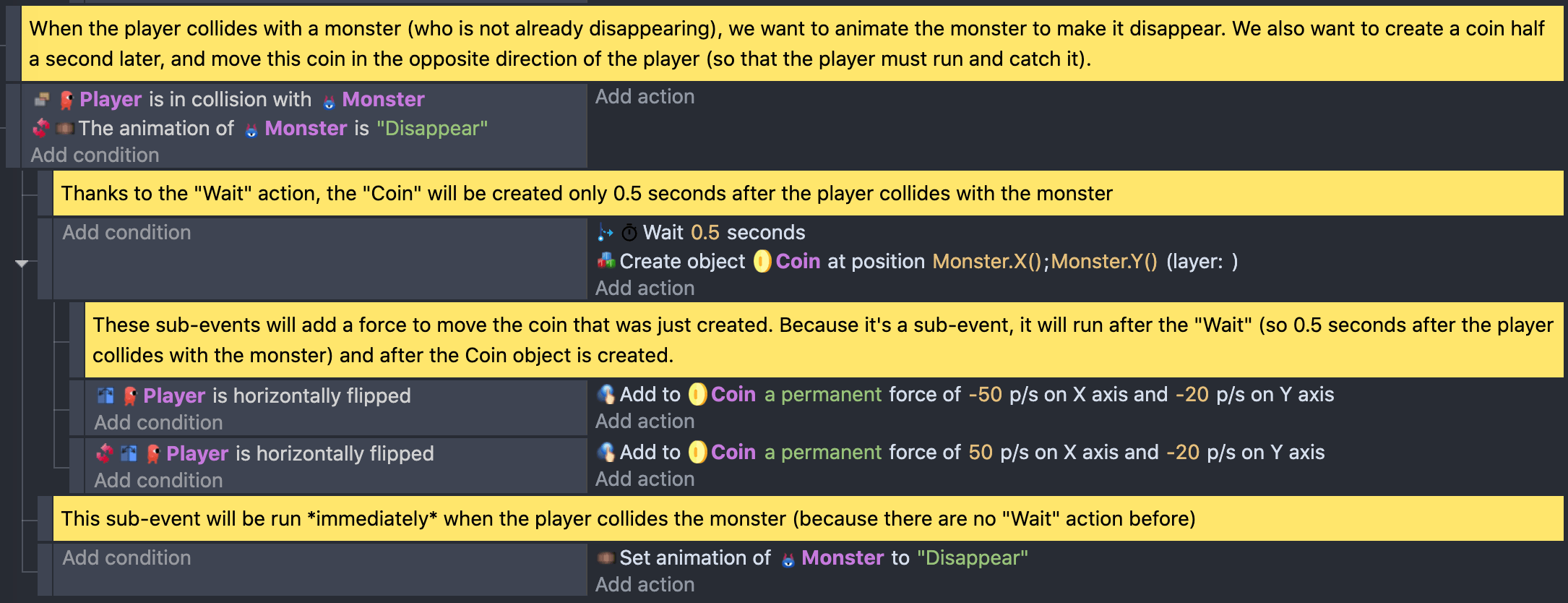 • Instead, prefer to use conditions like "At the beginning of the scene", a collision condition (with either a "Trigger Once" or an action to delete one of the object), etc...