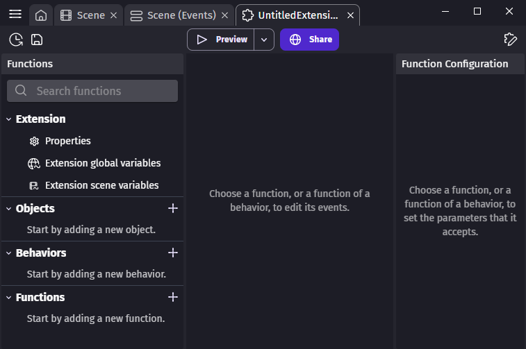 Similarly to scenes or external events, functions are written with events. They allow to create new conditions, new actions and new expressions that add up to GDevelop features. They are a good way to organize events, avoid duplication and share features with the community.