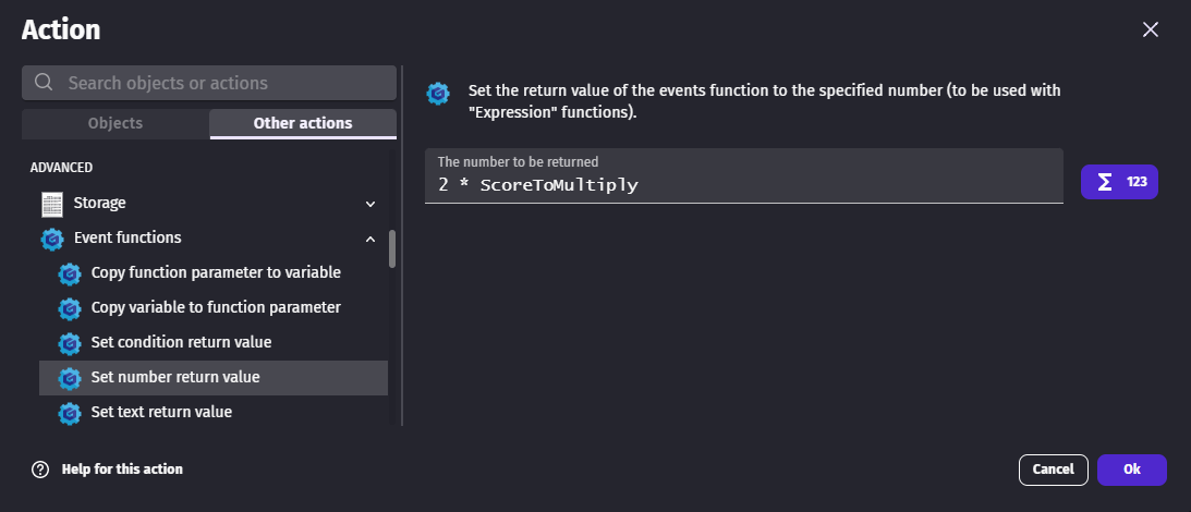 Function that are conditions or expressions must return a value. The returned value can be chosen with 3 actions from the Event functions category: